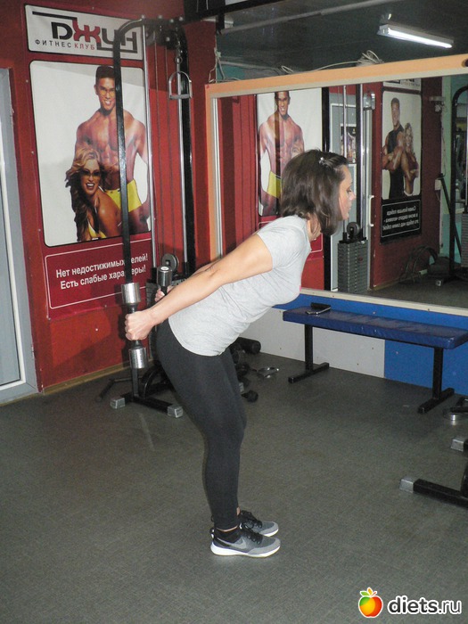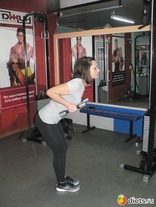 - становую тягу – движение только в тазобедренном суставе, руки с гантелями как ниточки свисают вдоль ног.