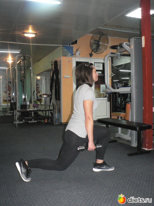 - выпады назад и в стороны – в этих упражнениях работу бедра и ягодиц также можно дополнить нагрузкой на бицепс. Для этого в выпаде сгибайте руки в локтях и подтягивайте гантели к груди, а на подъеме опускайте руки вдоль корпуса;