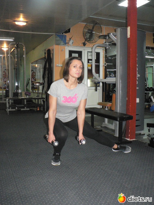 Увеличить эффективность приседаний и выпадов можно, если удерживать во время их выполнения в руках те же гантели. А еще можно добавить в нижней точке выпрямление рук с утяжелителем над головой. Это позволит параллельно проработать еще и мышцы спины.