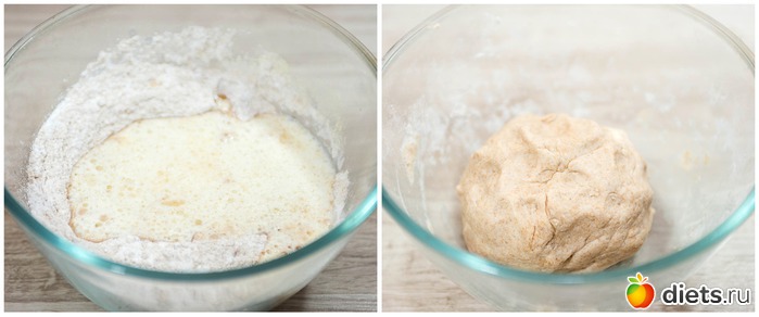 1. Сначала приготовим основу. Для этого отдельно смешиваем два вида муки, сахар (подсластитель), ванилин на кончике ножа. И отдельно смешиваем жидкие ингредиенты: воду, творог, масло оливковое. В муке делаем углубление и вливаем жидкую смесь, вымешиваем. Тесто получается мягкое и эластичное. Оборачиваем его пищевой пленкой и убираем в холодильник на половину часа.
