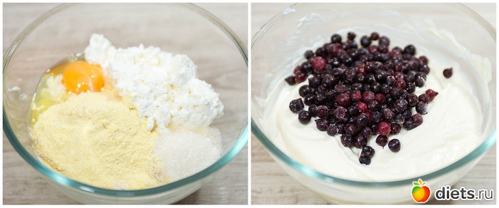 2. Теперь приготовим творожную начинку. Отдельно соединяем творог, кефир, яйцо, сахар, ванилин и кукурузную муку. Взбиваем все погружным блендером тщательно, до однородности. Всыпаем половину ягод в творожную массу.