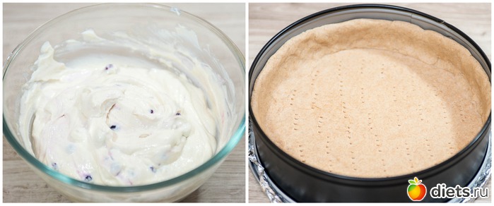 3. Аккуратно все перемешиваем ложкой, чтобы не перемять ягоды. Тесто достаем из холодильника. Рабочую поверхность слегка присыпаем рисовой мукой и раскатываем тесто в пласт, аккуратно переносим его в разъемную форму (дно которой желательно застелить пергаментом или фольгой), формируем бортики, накалываем дно вилкой.