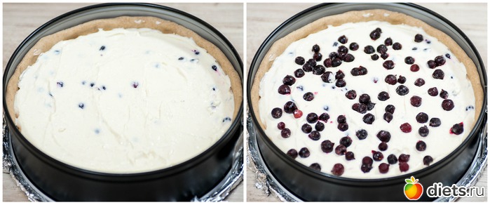 4. Вливаем в форму творожную начинку, оставшиеся ягоды высыпаем сверху ровным слоем, слегка углубляя их в творог.