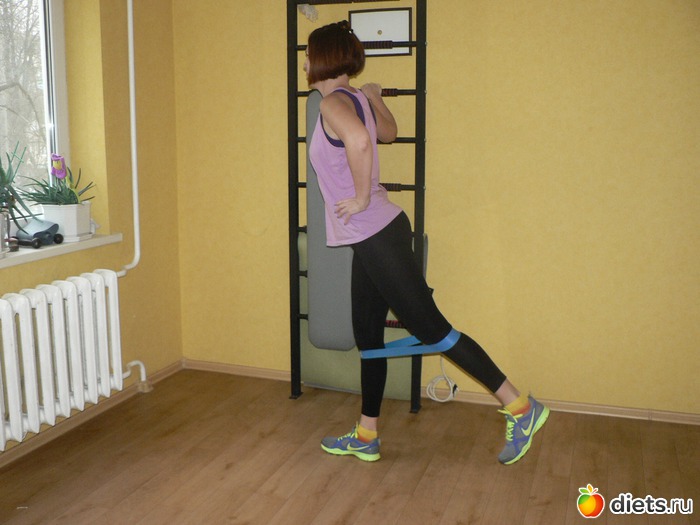 И снова беремся за длинный эспандер. Становимся на четвереньки. На одном конце ленты завязываем петлю и фиксируем в ней стопу одной ноги, эту ногу выпрямляем, ее мыском упираемся в пол . Второй конец эспандера удерживаем противоположной рукой. Из этого положения делаем 20 махов вверх прямой ногой, затем этой же ногой выполняем еще 20 таких же махов, сопровождая их тремя пружинящими движениями в верхней точке. В заключение делаем еще 7 пружинящих движений рабочей ногой в верхней точке маха и все то же повторяем сначала для другой ноги.