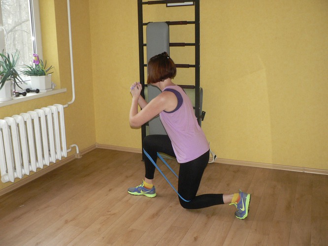 Поднимаемся с пола, закрепляем резинку чуть ниже колен. Делаем по 20 выпадов назад на каждую ногу, преодолевая сопротивление резинки. Затем выполняем еще по 20 выпадов на каждую ногу, но каждый выпад сопровождаем тремя пружинящими движениями внизу. В заключение один раз делаем по 7 пружинящих движений в выпаде на каждую ногу.