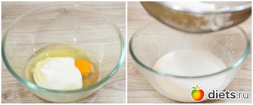 1. В глубокой миске соединяем куриное яйцо, 2 белка, натуральный йогурт, сахар (подсластитель), соль, ванилин. Взбиваем все до однородности и сюда же просеиваем муку.