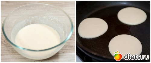 2. Снова хорошенечко все взбиваем, добавляем соду, можно погасить её лимонным соком, перемешиваем. Разогреваем антипригарную сковороду, смазываем её каплей растительного масла (либо масло вовсе не добавляем), небольшим половником или глубокой ложкой вливаем в сковороду тесто порциями.