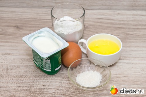 1. В глубокой миске соединяем куриное яйцо, 2 белка, натуральный йогурт, сахар (подсластитель), соль, ванилин. Взбиваем все до однородности и сюда же просеиваем муку.