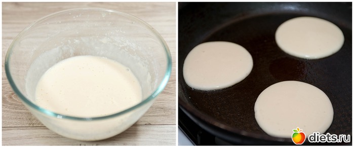 2. Снова хорошенечко все взбиваем, добавляем соду, можно погасить её лимонным соком, перемешиваем. Разогреваем антипригарную сковороду, смазываем её каплей растительного масла (либо масло вовсе не добавляем), небольшим половником или глубокой ложкой вливаем в сковороду тесто порциями.