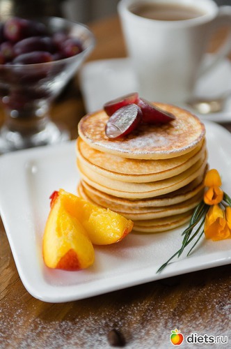 4. Подаем готовые оладьи, полив медом, нежирной сметаной, йогуртом, украсив свежими ягодами или фруктами.