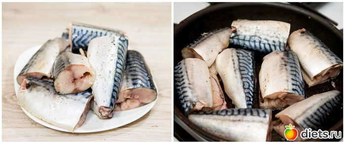 1. Рыбу (без головы, хвоста и плавников) разрезаем вдоль на 2 части, солим, перчим по вкусу, оставляем на 20-30 минут. После чего разогреваем антипригарную сковороду, слегка смазываем её оливковым маслом, либо не смазываем вовсе.