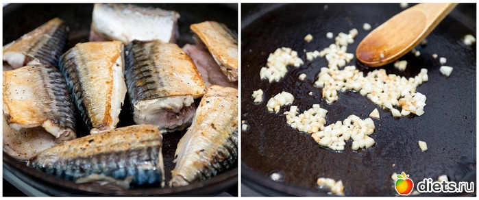 2. Обжариваем рыбу с двух сторон (с одной 5 минут, с другой 3 минуты), снимаем на тарелку. На той же сковороде (не добавляя масла) обжариваем измельченный чеснок, до светло-золотистого цвета.
