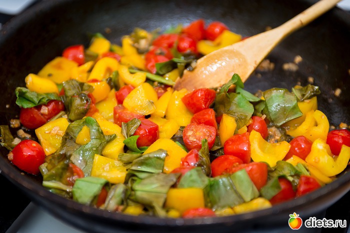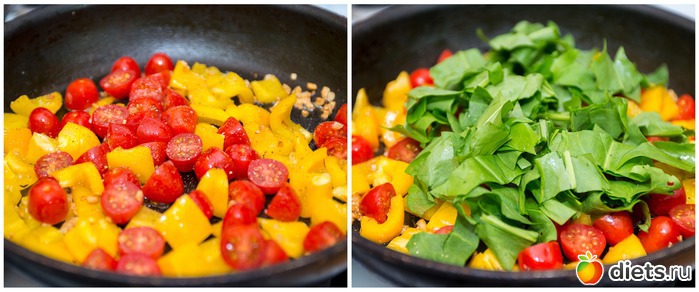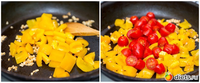 3. Отправляем к чесноку нарезанный кубиками сладкий перец, обжариваем пару минут, после чего добавляем половинки помидор черри (если помидорки мелкие, то добавляем их целиком), обжариваем до мягкости.