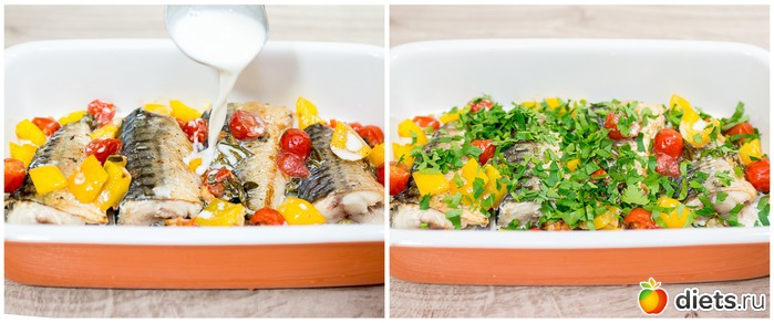 Существует очень много рецептов приготовления скумбрии с овощами: её можно запекать целиком, на овощной подушке, фаршировать, из филе крутить рулетики, заворачивая в них овощную начинку… Мы же предлагаем запечь куски рыбы в сливках с овощами, зеленью и сыром. Это довольно простое, но очень вкусное блюдо, по достоинству оценят даже за праздничным столом.