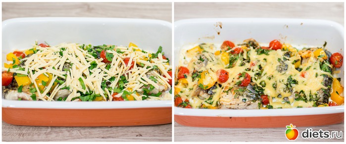5. В форму для выпекания выкладываем куски рыбы, затем овощи из сковороды.