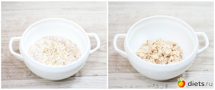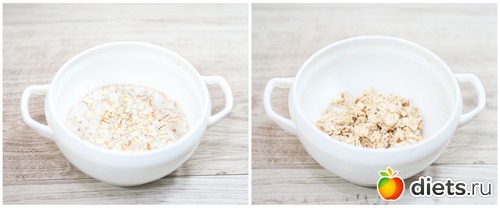 1. Овсянку заливаем горячим молоком и отставляем в сторону, даем ей набухнуть, после чего её отжимаем.