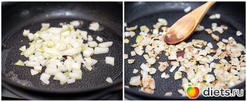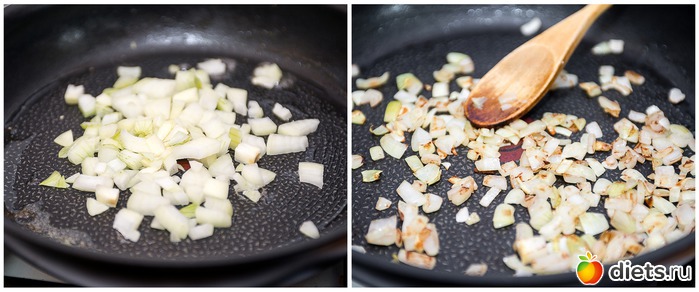 2. Одну луковицу чистим, шинкуем и обжариваем до золотистого цвета в разогретой сковороде, смазанной каплей растительного масла.