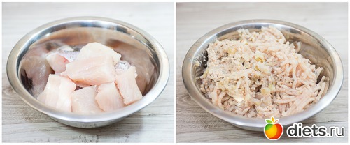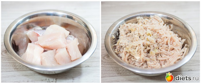 3. Щуку моем, чистим, удаляем внутренности, голову и хвост, острым ножом срезаем филе. Прокручиваем рыбу, обжаренный лук и овсянку через мясорубку.