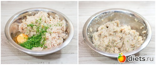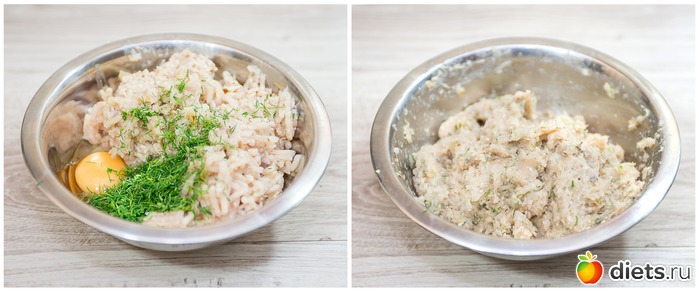 4. Добавляем в фарш яйцо, зелень, соль, перец и специи для рыбы. Тщательно, руками все вымешиваем до однородности.