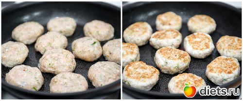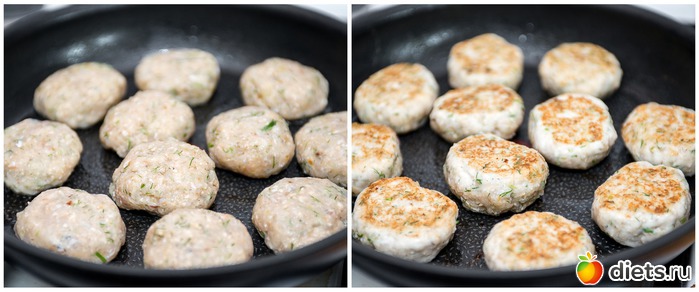 5. Мокрыми руками формируем котлетки и обжариваем на антипригарной сковороде по паре минут с обеих сторон (до золотистого цвета).