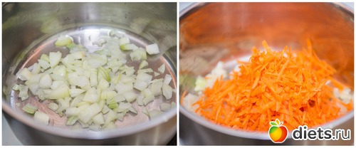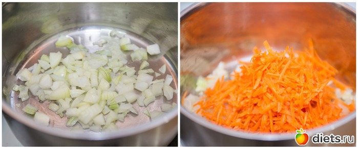 6. Тем временем, приготовим подливку. Луковицу чистим и измельчаем. Отправляем её в раскаленную сковороду с высокими бортиками, либо в небольшую кастрюльку с толстым дном, смазанную каплей растительного масла. Обжариваем лук пару минут и добавляем к нему натертую на крупной терке морковь, жарим овощи еще пару минут.