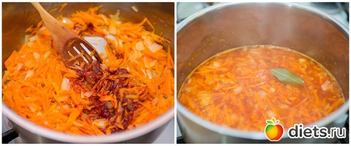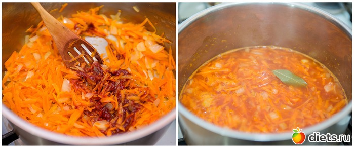 7. Добавляем к луку с морковью томатную пасту, перемешиваем и вливаем кипяток, добавляем лавровый лист, солим и перчим по вкусу.