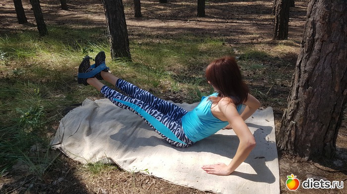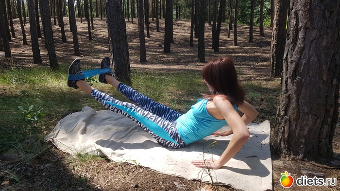 Для выполнения этого упражнения понадобится фитнес-резинка. Сядьяте на пол. Резинку накиньте на стопы, прямые ноги поднимите над полом на небольшую высоту, корпус отклоните назад, примите упор на ладони согнутых в локтях рук, разместив их за спиной.