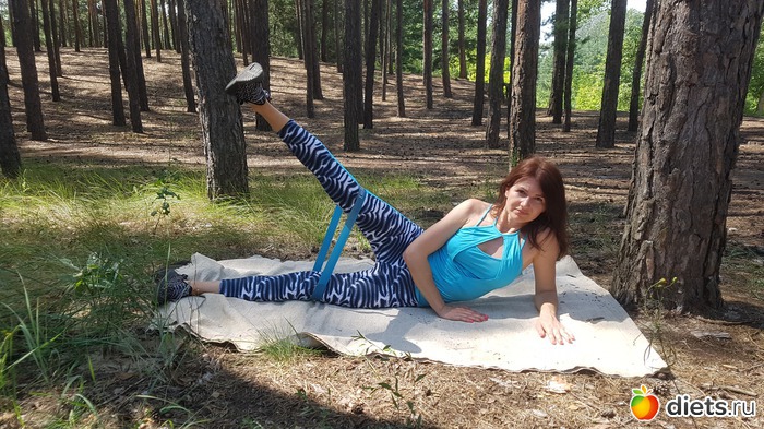 Выполните 20 махов верхней прямой ногой вверх, старайтесь пятку при этом направлять в потолок. Затем перевернитесь на другой бок и выполните еще 20 аналогичных махов другой ногой.