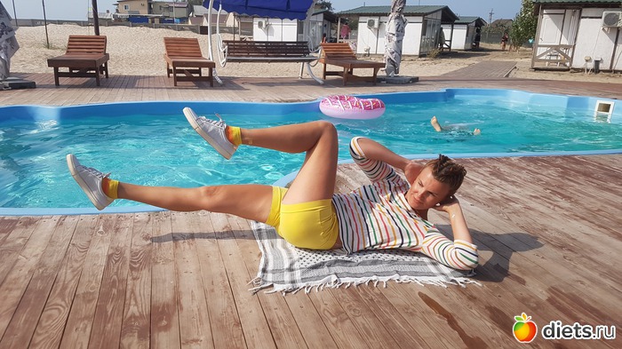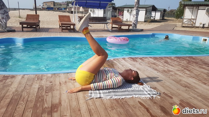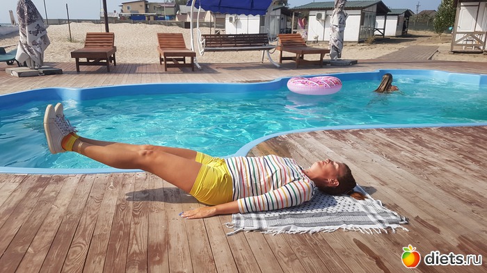Теперь потянитесь к поднятым ногам прямыми руками, подняв над полом голову и плечи.