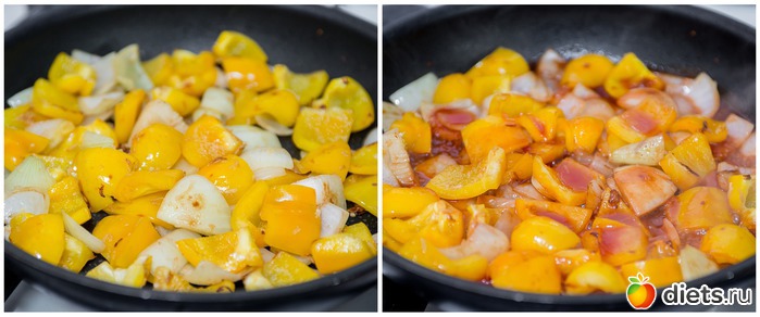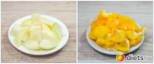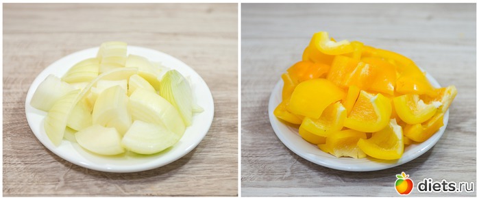 1. Подготовим овощи. Лук чистим и крупно нарезаем. Болгарский перец моем, удаляем плодоножку, семена и нарезаем также крупно.