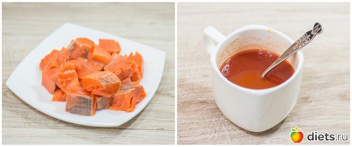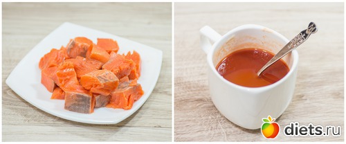 2. Рыбное филе нарезаем средними кусочками, слегка подсаливаем. Для соуса смешиваем мед, кетчуп и яблочный уксус.