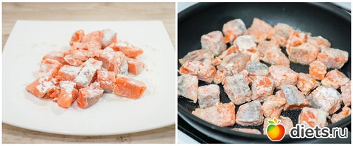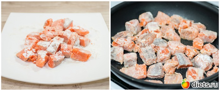 3. На плоскую тарелку выкладываем кусочки рыбы и посыпаем крахмалом, как следует обваливаем их в нем. Антипригарную сковороду хорошенько прогреваем, слегка смазываем растительным маслом и обжариваем кусочки рыбы, периодически помешивая, со всех сторон, в течении 7 минут, до золотистой корочки.