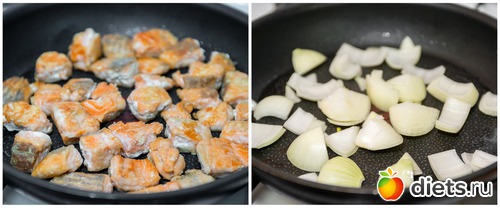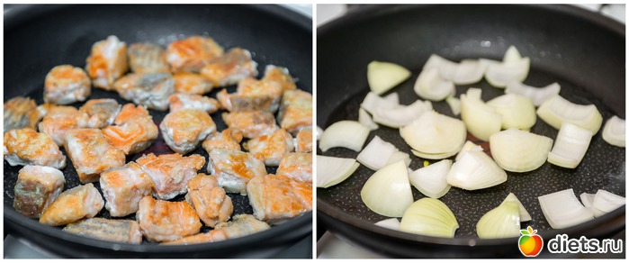 4. Затем рыбу убираем в отдельное блюдце, а на ту же сковороду перекладываем лук.