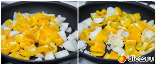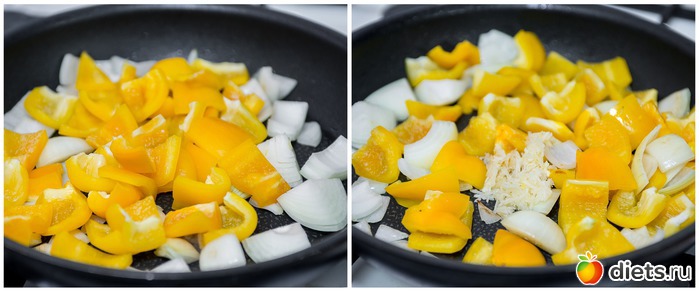 5. К луку отправляем болгарский перец и выдавленный через пресс чеснок.