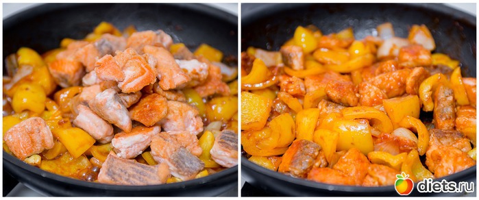 7. Когда соус прогреется, отправляем в сковороду кусочки рыбы, Все перемешиваем, чтобы соус покрыл каждый кусочек рыбы, хорошенько прогреваем и снимаем с огня. Солим, перчим блюдо по вкусу.