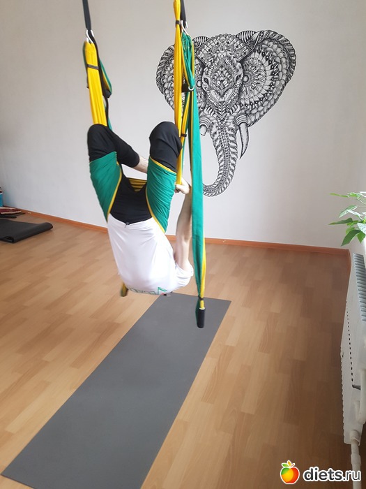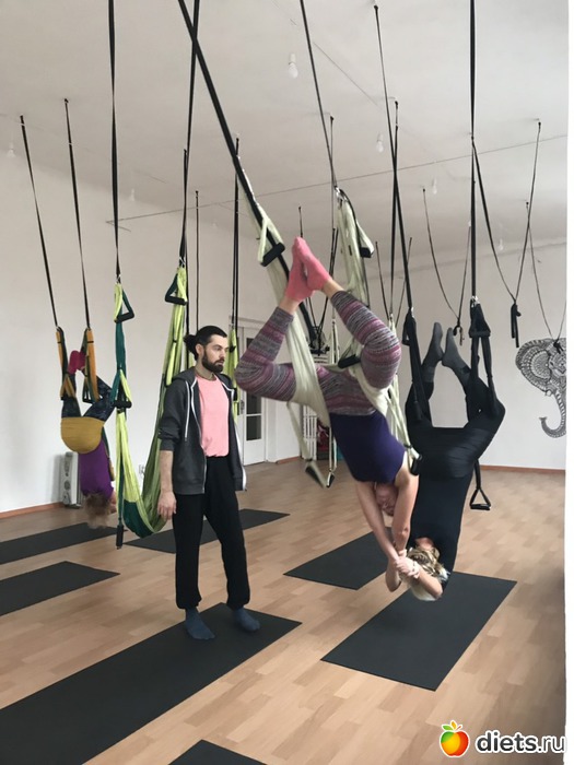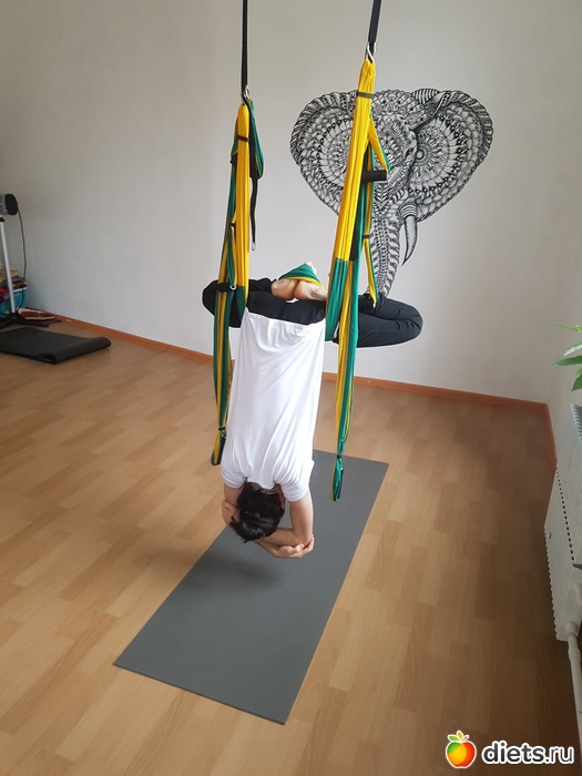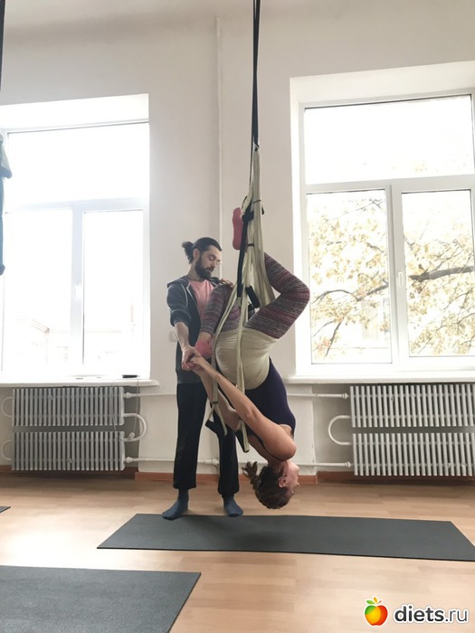 Опытный тренер шаг за шагом, поддерживая вас в гамаке, объяснит, как выйти в перевернутую асану. Лишь убедившись, что вы все сделали правильно, и надежно зафиксированы в ткани, отпустит вас в «свободный полет».