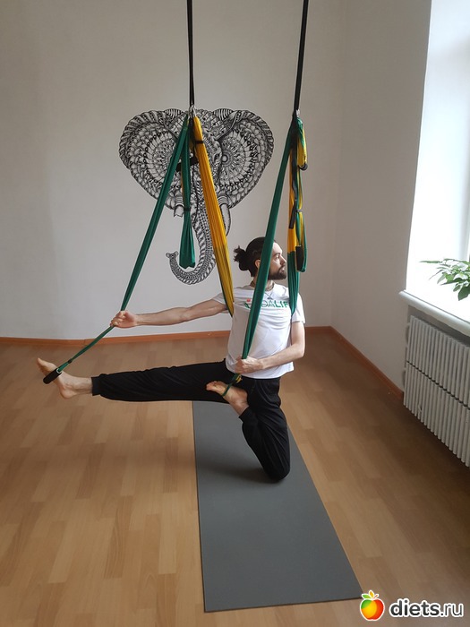 При этом с гамаком оказываются доступны как позы с касанием пола руками или ногами, так и возможность полностью повиснуть в воздухе, обвившись в ткани гамака.