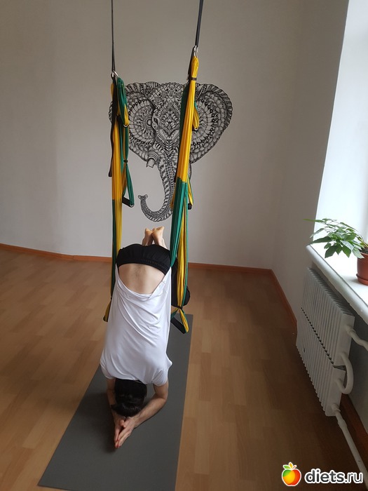 Также, повиснув в гамаке вниз головой, вы можете принять упор руками в пол, и из этого положения продолжить мягкую растяжку позвоночника с помощью различного рода скручиваний. Те перевернутые асаны и балансы, которые вы долгое время боялись отстраивать на гимнастическом коврике или даже у стены, с помощью гамака за короткое время станут вам легко доступны. Ведь без него в перевернутых стойках вам нужны сильные руки, плечи и шея. Повиснув же в гамаке, все вышеупомянутые части тела расслаблены, и вы попросту наслаждаетесь асаной.