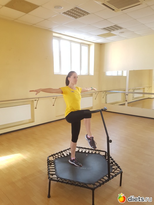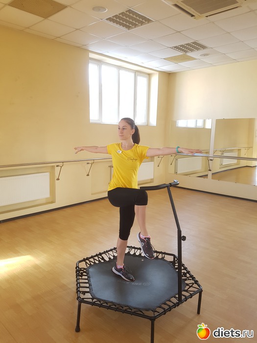 Затем тренер сжалилась над нами и дала небольшой блок на развитие баланса и гибкости. Но оказалось, что балансировать на батуте в йоговской Позе дерева, тоже непросто. Ведь опора батута нестабильна, и сохранять на ней баланс куда сложнее, чем на полу или земле.