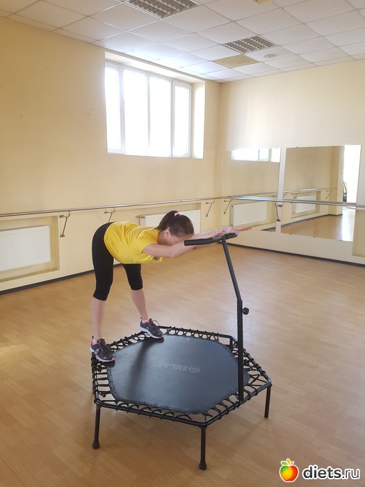 А вот потянуть спину и заднюю поверхность ног было приятно, приняв упор руками на ручку батута, а ноги зафиксировав на его краю.