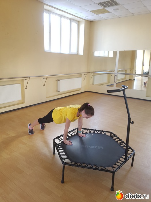 После кардио части последовал блок на работу основных мышечных групп. С этой целью мы выполнили несколько разновидностей планок и статичных, и динамичных с опорой руками на край батута, а мысками ног – в пол.