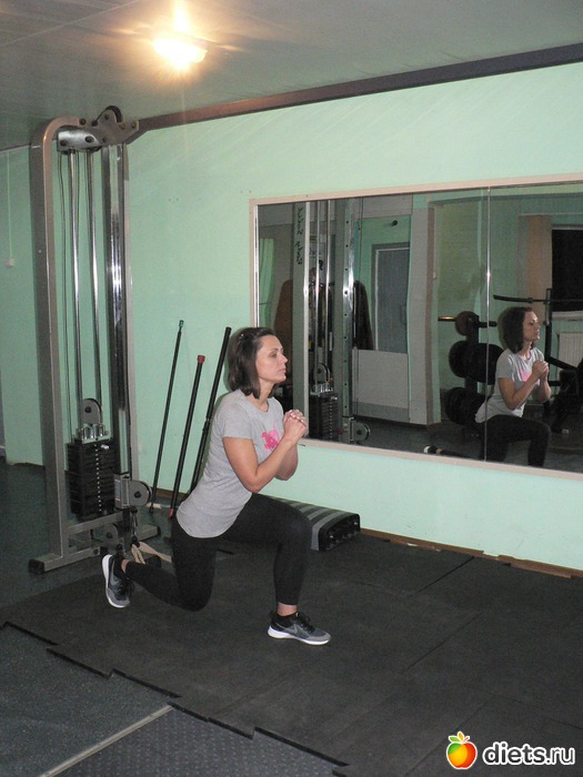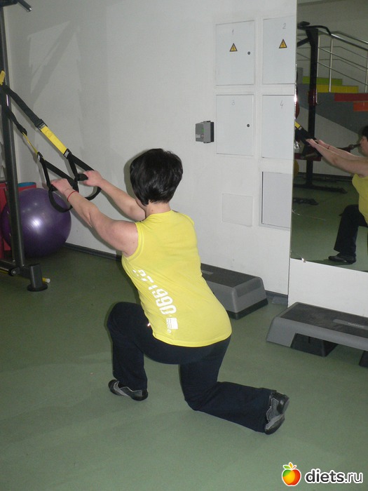 Опять же, если имеются проблемы с избыточным весом или суставами, делайте все три подхода к выпадам, держась руками за тренировочные петли. Они послужат своеобразным рычагом, который облегчит вам подъем.