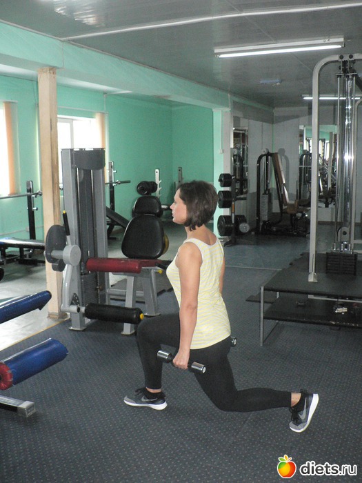 Второй подход к выпадам назад сделайте, удерживая в руках гантели или медбол.