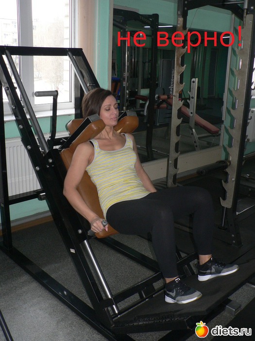 Следующее упражнение – наклоны в Гакк машине. Девушки часто работают в этом тренажере спиной к вертикальной подушке. Однако такая техника выполнения по сути приседаний для девушек не подходит, поскольку в ней опять же в большей степени задействована передняя часть бедра.