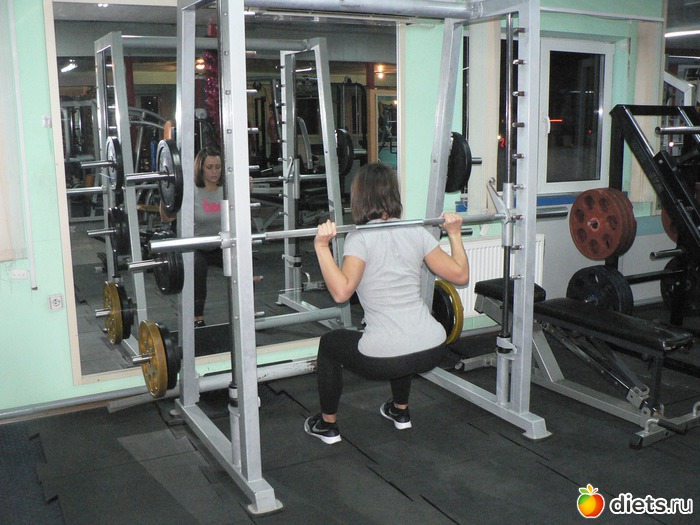 Третий подход к приседаниям сделайте либо удерживая на плечах бодибар, либо в тренажере Смита.