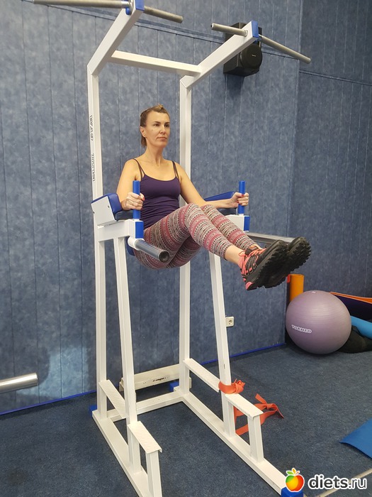 Над нижним прессом поработаем в упоре локтями на брусьях. Из этого положения поднимайте чуть согнутые в коленях ноги вверх так, чтобы колени оказывались над локтями. Повторите упражнение 12-15 раз в три подхода.