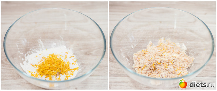 1. Для начала приготовим лимонный курд (крем). С лимона снимаем цедру. Коричневый сахар (или сахарную пудру) смешиваем с цедрой и перетираем руками, оставляем на 30 минут.