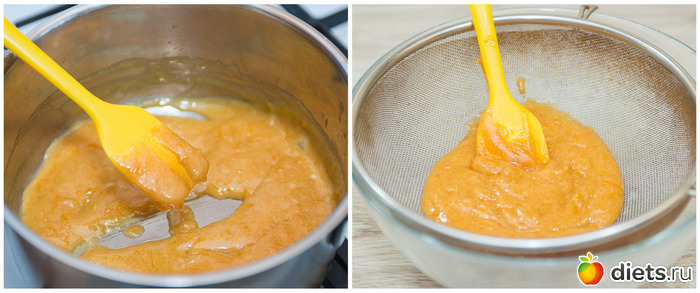 3. Теперь на маленьком огне, постоянно помешивая, провариваем смесь до загустения. Чтобы определить, готов ли курд, проводим по лопатке пальцем, если след от пальца на лопатке не расплывается, крем готов. Пропускаем его через сито в глубокую миску.