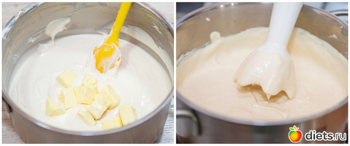 5. Пробиваем все блендером и отправляем в кастрюлю с толстым дном, ставим все на медленный огонь и постоянно помешивая, доводим смесь до кипения. Как только масса начнет булькать – снимаем кастрюлю с огня и ставим в большое блюдо с ледяной водой. Остужаем массу до комнатной температуры.