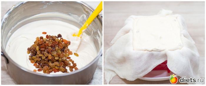7. Теперь добавляем в будущую пасху измельченные цукаты, заранее вымоченный и промытый изюм, курагу, орешки… и перемешиваем. Пасочницу застилаем марлей, сложенной в 3-4 слоя и выливаем в неё творожную смесь, сверху накрываем марлей и убираем в холодильник под пресс минимум на 10 часов.